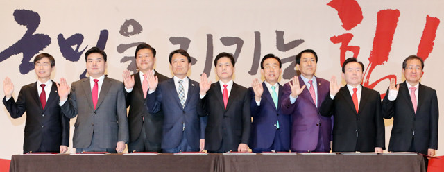 자유한국당 대선 후보자들이 17일 오후 서울 여의도 63빌딩에서 열린 ‘자유한국당 제19대 대통령 후보 선거 후보자 비전대회’에서 공정경선 서약을 한 후 포즈를 취하고 있다. 왼쪽부터 조경태, 원유철, 신용한, 김진태, 김진, 김관용, 안상수, 이인제, 홍준표.