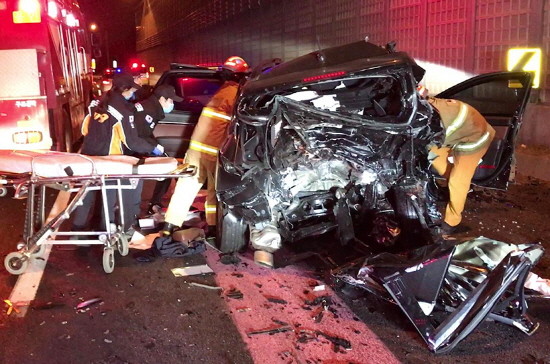 경기도 용인시 영동고속도로 인천방향 신갈 분기점 근처에서는 18일 오전 1시 20분쯤 승용차를 몰던 김모(43)씨가 갓길에 있던 조모(46씨)의 SUV를 들이 받는 사고가 일어났다.