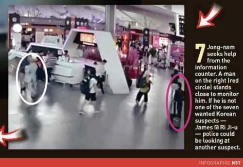 두 남성 중 한명은 김정남이 셀프체크인기기로 향하는 것을 주시하고 있는 모습이다. 특히 여성 피의자들은 VX 신경작용제로 김정남을 공격한 뒤 그에게 손을 흔들어 보이는 행동을 취한 것으로 판단된다.