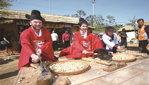 | ▲ '산청한방약초축제'에 참가한 궁중의상을 입은 외국인들이 직접 약재썰기를 체험하고 있다. | ||