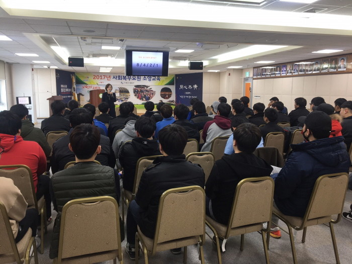 경기 수원시 팔달구는 지난 17일 구청 대회의실에서 각 과·동 사회복무요원 80여명이 참석한 가운데 '사회복무요원 소양교육'을 실시했다. 사진은 '전략적 사고와 커뮤니케이션' 이라는 주제로 교육이 진행 중인 모습.(사진제공=팔달구청)