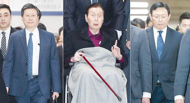 경영비리 의혹을 받고 있는 롯데 총수 일가의 첫 정식 재판이 20일 오후 서울 서초구 중앙지법에서 열렸다. 이날 신동주 전 롯데홀딩스 부회장(왼쪽 사진), 신격호 롯데그룹 총괄회장(가운데 사진), 신동빈 롯데그룹 회장이 재판에 출석하고 있다.