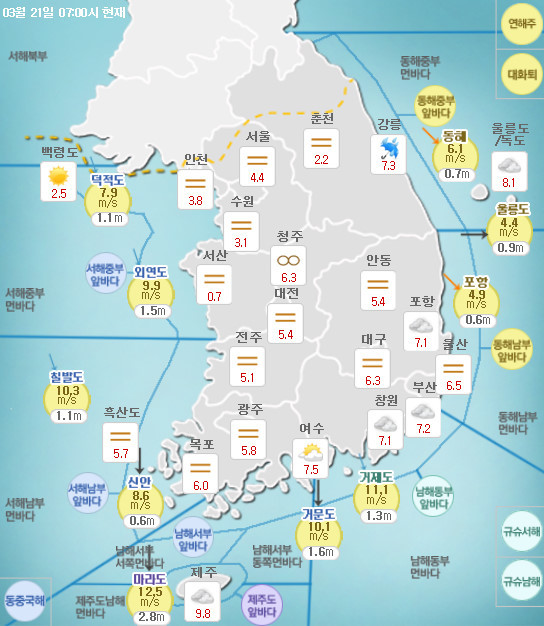 21일 기상청에 따르면 중부지방의 날씨는 중국 산둥반도 부근에 위치한 고기압의 영향을 차차 받겠고, 남부지방은 저기압의 영향에서 차차 벗어날 것으로 보인다.