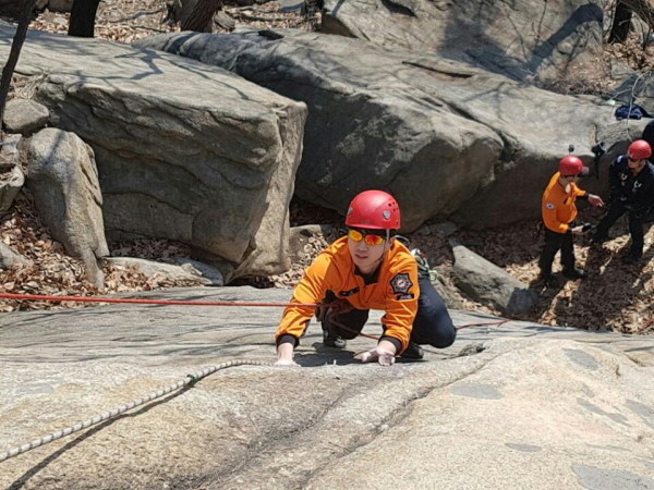 관악소방서는 산악 안전사고 대비를 위해 최근 관악산 일대에서 산악안전 시설물 점검과 산악 인명구조 훈련을 실시했다. 사진은 소방공무원이 등반 훈련을 하는 모습.(사진제공=관악소방서)