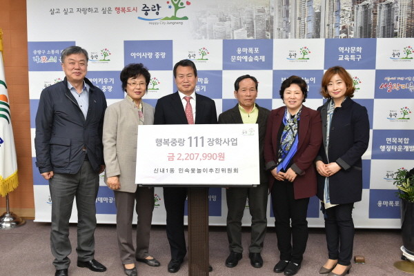 나진구 중랑구청장(왼쪽 세번째)이 지난 20일 오전 10시30분 구청장실에서 ‘신내1동 민속윷놀이추진위원회’에게 ‘행복중랑 111 장학사업’ 기탁금 220여만원을 전달받고 기념 촬영을 하고 있다.(사진제공=중랑구청)