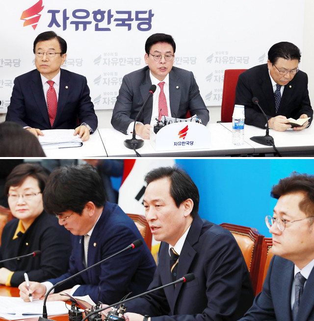 자유한국당 정우택 원내대표가 21일 오전 국회에서 열린 원내대책회의에서 “박근혜 전 대통령이 검찰에 출석하면서 국민 여러분께 송구스럽고 성실히 조사에 임하겠다고 한 만큼 오늘 출석으로 모든 진실이 밝혀지기를 기대한다”고 밝히고 있다(위). 더불어민주당 우상호 원내대표(오른쪽 두번째)가 21일 오전 국회 원내대표실에서 열린 원내대책회의에 참석해 발언하고 있다.