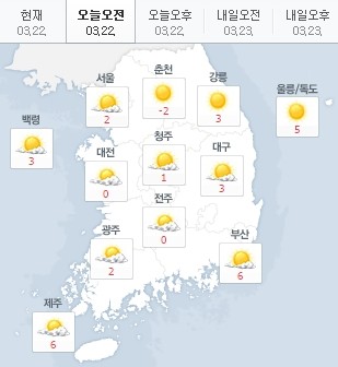 22일 오전 서울은 2도, 춘천 영하 2도, 청주 1도, 대구 3도, 부산 6도, 제주 6도를 기록 중이다.