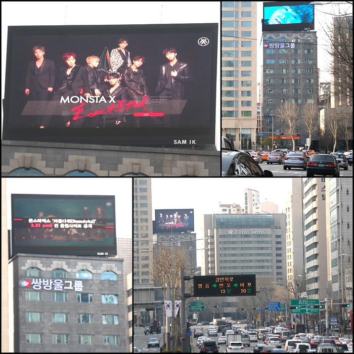 몬스타엑스 컴백일인 지난 21일 서울 강남구 청담동 쌍방울빌딩 전광판에는 몬스타엑스 새 앨범 '뷰티풀(BEAUTIFUL)' 컴백 및 1위 기원 응원 영상이 송출돼 시선을 사로잡았다.