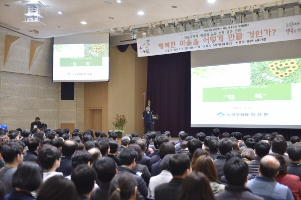 김성환 노원구청장은 지난 21일 오전 10시 구청 대강당에서 열린 ‘제29회 화요 실사구시 정책포럼’에 참석해 ‘행복한 마을을 어떻게 만들 것인가’란 주제로 특강을 진행했다. 사진은 김 구청장이 강의하는 모습.(사진제공=노원구청)