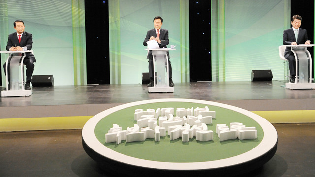 국민의당 대선주자들이 22일 오후 서울 목동sbs 스튜디오에서 열린 sbs 대선후보 경선토론회를 준비하고 있다. 왼쪽부터 박주선 국회 부의장. 손학규 전 민주당 대표, 안철수 전 대표.