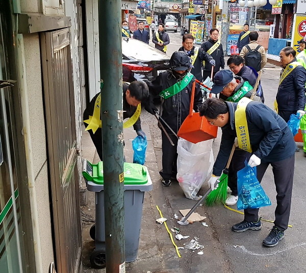 서울 은평구는 지난 22일 오전 7시 연신내역 물빛공원을 비롯한 지역내 16개 지역에서 구민들과 함께 겨우내 찌든 때와 오물, 쓰레기를 제거하는 새봄맞이 대청소를 실시했다. 사진은 김우영 구청장 및 참여자들이 쓰레기를 수거하는 모습.(사진제공=은평구청)