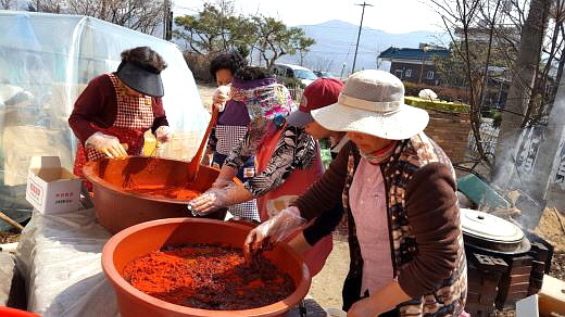최근 경기 여주시 점동면 행복나누미회는 이웃돕기 기금을 마련하자는 취지에서 '고추장 담기 행사'를 개최했다. 사진은 행사에 참가한 행복나누미회 관계자들이 고추장을 담고 있는 모습.(사진제공=여주시청)