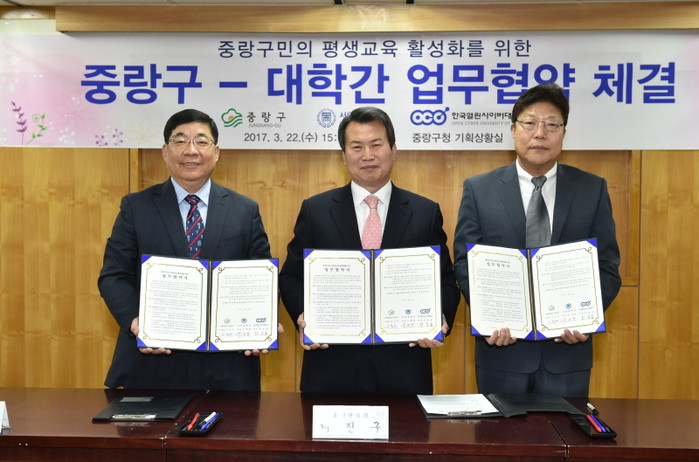 나진구 서울 중랑구청장(가운데)이 지난 22일 오후 3시 구청 기획상황실에서 서일대학교 및 한국열린사이버대학교와 함께 ‘학습·봉사·일자리의 트라이앵글 시스템 구축과 구민의 평생교육 활성화’를 위한 업무협약을 맺고 기념촬영을 하고 있다.(사진제공=중랑구청)