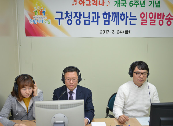 경기 수원시 영통구는 24일 영통구 방송동호회 ‘아그리나 개국 6주년’을 맞아 이상훈 구청장을 특별DJ로 초청해 특집방송을 진행했다. 사진은 이 구청장(가운데)이 방송을 진행하는 모습.(사진제공=수원시청)