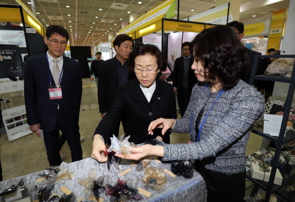 최근 강남구 코엑스에서 ‘2017 서울국제소싱페어’가 개최됐다. 사진은 행사에 참석한 신연희 강남구청장(가운데)이 관계자들과 함께 강남관 전시장에 전시된 상품들을 살펴보는 모습.(사진제공=강남구청).