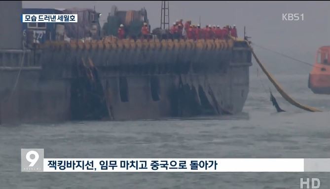 세월호를 끌어올려 이곳까지 끌고 온 잭킹 바지선은 임무를 마치고 예인선에 이끌려 중국으로 돌아갔다.