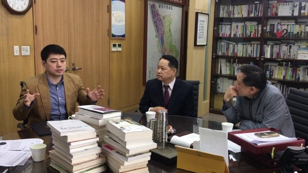 금천구는 최근 독산3동의 한 금은방에서 발생한 강도사건에서 맨몸으로 강도를 제압해 검거하는데 큰 기여를 한 용감한 시민 3명에게 감사장를 수여했다. 사진은 유성씨(왼쪽)와 김재록(가운데)씨가 차성수 구청장에게 범인을 제압하는 상황을 설명하는 모습.(사진제공=금천구청)