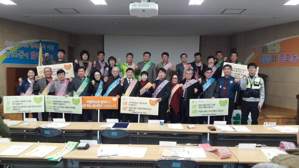 최근 경기 이천시 증포동주민센터에서는 기관, 사회단체장, 통장단, 각 단체 회원 70여명이 참석한 가운데 ‘참시민, 이천행복나눔 운동’실천 실천대회를 열었다. 사진은 관계자들이 기념촬영을 하는 모습.(사진제공=이천시청)