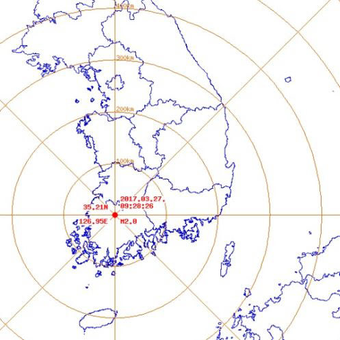 광주지방기상청은 27일 “오전 9시28분쯤 광주시 북구 북동쪽 5km 지역에서 규모 2.0의 지진이 발생했다”고 밝혔다. 진앙지는 북위 35.23도, 동경 126.94도다.