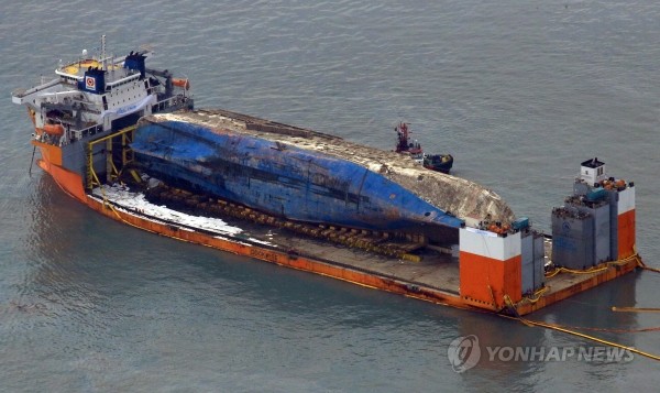 | ▲ 세월호가 26일 오전 반잠수선 갑판에 수평을 맞춰 안정적인 모습으로 얹혀 있는 모습.세월호는 2∼4일 정도 배수를 한 후 목포 신항을 향해 '마지막 항해'에 나선다..(사진제공=연합뉴스) | ||