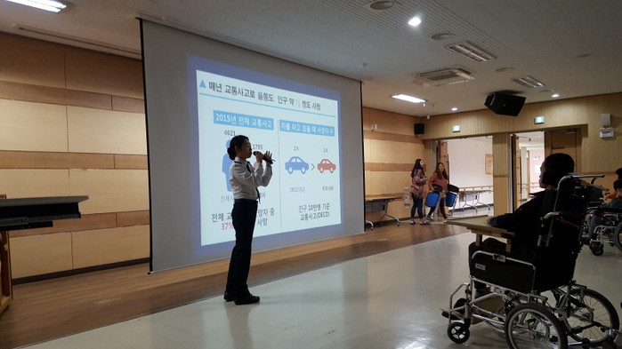 경기 김포경찰서에서는 지난 24일 새솔학교(14년 설립된 초·중·고 특수교육 전문학교)를 방문해 유치원부터 고등학생 총 129명 전교생 대상으로 '맞춤별 교통안전 교육'을 실시했다. 사진은 경찰관이 강의하는 모습.(사진제공=김포경찰서)