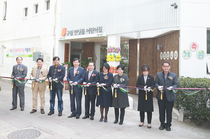 최근 서울 도봉구는 창동대우아파트에 위치한 주민공동시설을 무상으로 임대받아 리모델링해 ‘구립 반딧불 어린이집’을 조성하고 개원식을 개최했다. 사진은 이동진 구청장(왼쪽에서 네 번째) 등의 관계자들이 테이프커팅을 하는 모습.(사진제공=도봉구청)