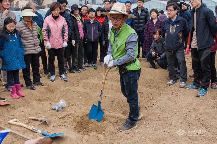 [시민일보=이대우 기자] 지난 25일 서울 강동구가 양지·암사·둔촌·가래여울·상일·강일텃밭을 동시 개장했다. 사진은 올해 처음 개장한 양지텃밭에서 감자 심기에 대한 설명을 듣고 있는 주민들의 모습.