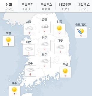 서울은 오전 3도, 춘천 2도, 대전 1도, 청주 2도, 부산 4도, 제주 7도를 기록 중이다.