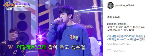 지난 27일 임재욱은 자신의 SNS에 한 개의 영상을 게재했다. 영상은 갓세븐 진영이 채널 A ‘싱데렐라 - 야식이 빛나는 밤’에 출연해 포지션 ‘I LOVE YOU’를 열창하고 있는 모습이다.