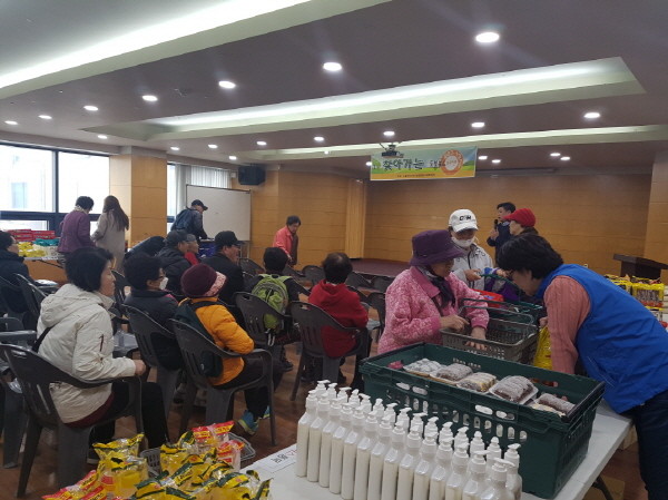 도봉구는 지난 27일 도봉서원종합사회복지관 대강당에서 식품 등을 기부받아 저소득 가구에 지원하는 ‘찾아가는 이동푸드마켓’을 개최했다. 사진은 이동푸드마켓을 방문한 지역 주민이 물건을 둘러보고 있는 모습.(사진제공=도봉포토)