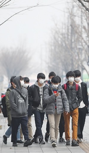 서울을 비롯한 수도권 미세먼지 농도가 ‘나쁨’ 수준을 보인 28일 서울 종로구 광화문 광장 인근에서 외국인 학생들이 마스크를 쓴 채 거리를 걷고 있다.