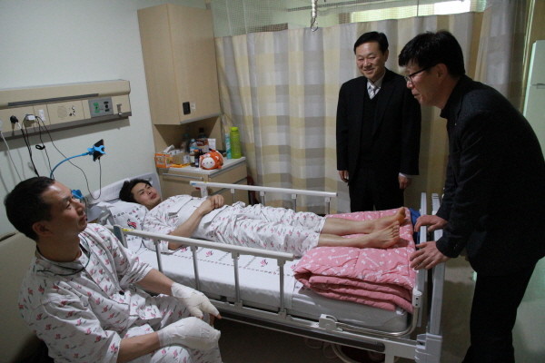 지난 28일 용산구청 공무원들이 서울 한강성심병원에 입원한 용산소방서 김성수(43ㆍ소방장)ㆍ최길수 대원(34ㆍ소방사)을 면회하고 성금 470만원 등을 전달했다. 이들 대원들은 지난 11일 다가구주택 화재 당시 불길을 몸으로 막아 주민들의 대피를 도왔다.(사진제공=용산구청)