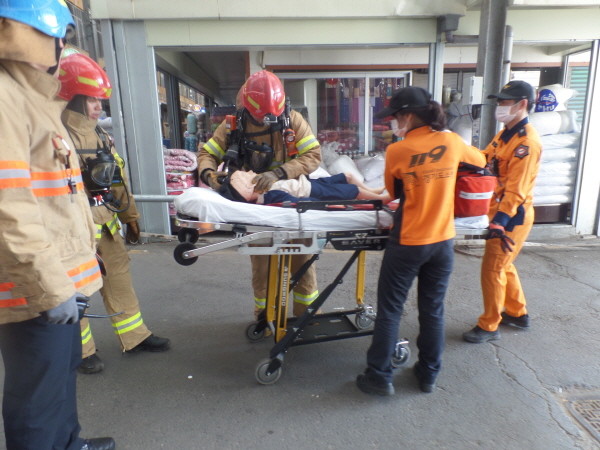 경기 안성소방서는 지난 28일 전통시장 화재 예방 및 인명·재산피해를 최소화하고자 안성시장 현장대응훈련을 실시했다. 사진은 사람모형을 대상으로 응급구조 훈련이 진행 중인 모습.(사진제공=안성소방서)