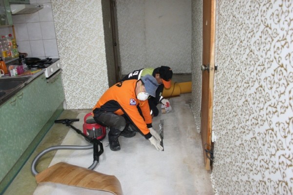 최근 경기 포천소방서는 영중·신북남성의용소방대원 등이 참여한 가운데 신북면에 위치한 저소득 취약가구 한 곳을 방문해 '집수리 봉사활동'을 실시했다. 사진은 집수리 활동에 참여한 의용소방대원들이 장판을 손보고 있는 모습.(사진제공=포천소방서)