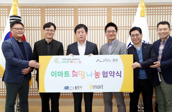 경기 용인시는 지난 29일 시장 집무실에서 지역내 이마트 7곳과 저소득 취약계층을 지원하는 ‘희망 나눔 프로젝트’ 협약을 체결했다. 사진은 정찬민 시장(왼쪽에서 세 번째)과 관계자들이 협약식 후 기념촬영을 하는 모습.(사진제공=용인시청)