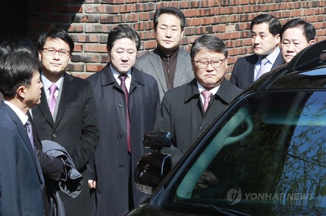 박근혜 전 대통령이 30일 오전 법원의 구속 전 피의자심문(영장실질심사)에 출석하기 위해 차량을 타고 서울 삼성동 자택을 나서자 자유한국당 의원들이 이를 바라보고 있다. 앞줄 왼쪽 부터 이완영,김태흠,윤상현, 유기준, 조원진, 박대출, 최경환 의원.