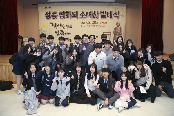 성동구는 지난 30일 오후 5시 구청에서 왕십리광장 소녀상 건립을 추진할 ‘성동 평화의 소녀상 건립 추진위원회’를 구성하고 발대식을 개최했다. 사진은 발대식 후 정원오 구청장(가운데)과 학생들이 기념촬영하는 모습.(사진제공=성동구청)