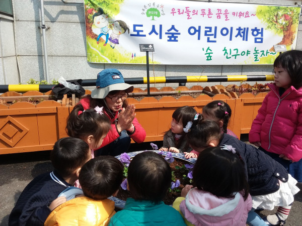 경기 안산시 본오3동은 30일 동주민센터 앞마당에서 지역내 소재 킹어린이집 소속 유아, 어린이, 교사 등 70여명이 참여한 가운데 숲 체험 행사를 개최했다. 사진은 숲 해설가가 어린이들에게 꽃에 대해 설명하는 모습.(사진제공=안산시청)