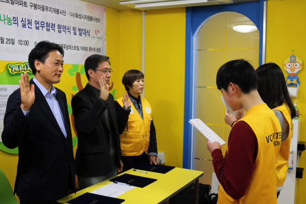 최근 경기 화성시 병점동 소재 구봉마을우남퍼스트빌아파트 구봉마을무지개봉사단과 (사)화성시자원봉사센터가 자원봉사활동의 발전과 활성화를 위한 업무협약을 체결했다. 사진은 협약식에서 서약을 하고 있는 관계자들의 모습.(사진제공=화성시청)