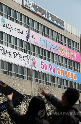 제19대 대통령 선거를 37일 앞둔 2일 서울 종로구 창경궁로 서울특별시선거관리위원회 외벽에 '선거 참여로 피어나는 아름다운 대한민국' 등이 적힌 대형 현수막이 게시되고 있다.