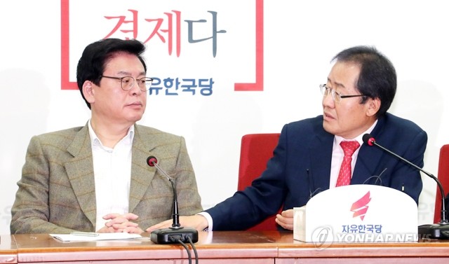 자유한국당 홍준표 대선후보(오른쪽)가 2일 오전 서울 여의도 당사에서 열린 첫 선거대책회의에서 정우택 당 대표 권한대행과 얘기를 나누고 있다.