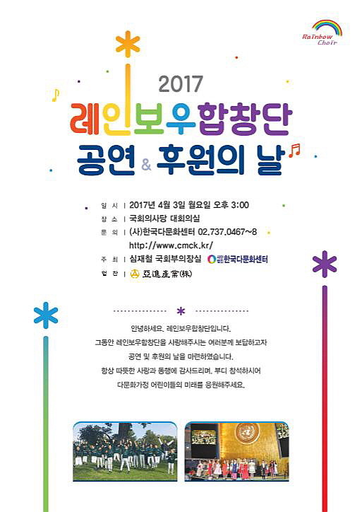 [시민일보=이진원 기자](사)한국다문화센터와 심재철 국회부의장실이 공동 주최하는 ‘레인보우 합창단 공연 및 후원의날’ 행사가 3일 오후 3시 국회의사당 대회의실에서 개최된다.