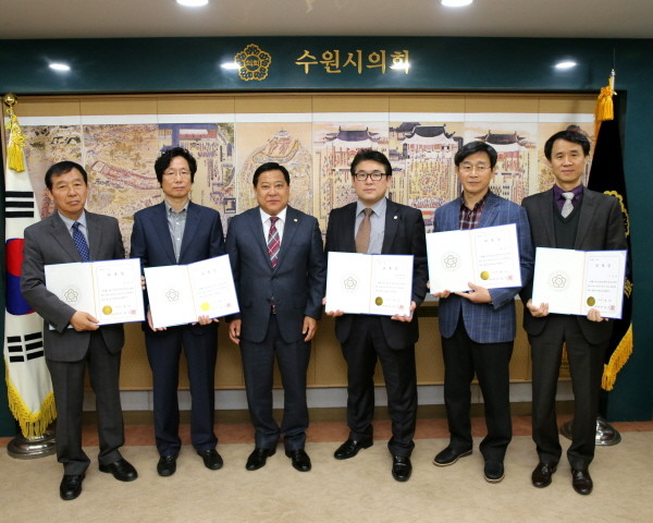 | ▲ 사진설명=경기 수원시의회 의장실에서 열린 결산검사위원 위촉식 모습. 왼쪽부터 최승덕, 이수승, 김진관 의장, 이철승, 류재석, 이종령 위원. | ||