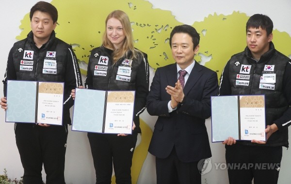 경기 수원시 경기도청에서 3일 오전 열린 '경기도체육회 루지팀 창단식'에서 주세기 코치, 아일렌 프리슈 선수, 남경필 도지사, 박진용 선수(왼쪽부터)가 기념촬영을 하고 있다.