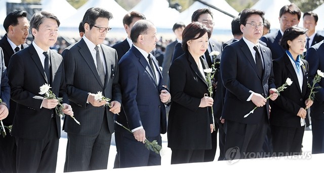 3일 오전 제주시 봉개동 제주 4.3 평화공원에서 열린 ‘제69주년 4.3 희생자 추념식’에서 정당 인사들이 헌화하고 있다. 왼쪽부터 국민의당 안철수 전 대표, 정병국 바른정당 전 대표, 더불어민주당 강창일 의원, 정의당 심상정 대표, 자유한국당 정우택 원내대표, 더불어민주당 추미애 대표.