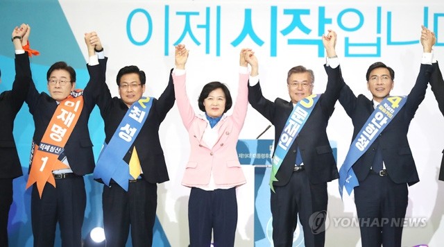 3일 서울 고척스카이돔에서 열린 더불어민주당 제19대 대통령후보자 수도권, 강원, 제주 선출대회. 왼쪽부터 이재명·최성 후보, 추미애 대표, 문재인·안희정 후보.