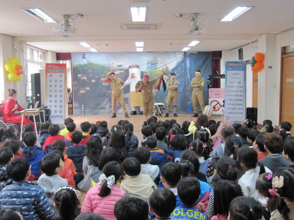 경기 부천대명초등학교 1~2학년 학생 276명은 최근 오정보건소와 협력한 종합예술창작극단 <깍뚜기>의 인형극 ‘담배는 앙돼요~!!’를 학교 강당에서 관람했다. 사진은 배우들이 열연하는 모습.(사진제공=부천교육지원청)