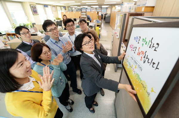 지난 3일 서울 동대문구는 부서마다 색다른 친절 실천을 위한 친절 문구를 선정했다. 사진은 구보건소 의약과 직원들이 ‘미소로 맞이하고 마음으로 해결합니다’라는 친절 목표가 담긴 친절 캐치프레이즈 액자를 사무실에 걸고 있는 모습.(사진제공=동대문구청)