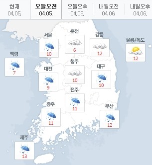 현재 서울은 10도, 춘천 6도, 강릉 12도, 대전 9도, 대구 10도, 부산 12도, 제주 13도를 기록 중이다.