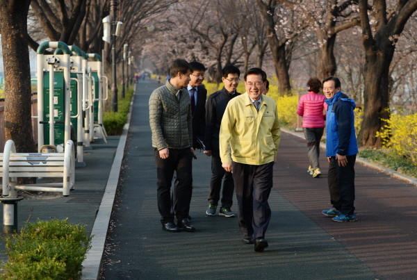 지난 4일 오전 중랑천 뚝방길을 찾은 유덕열 동대문구청장(가운데)과 구 직원들이 7~9일 열리는 '동대문 제7회 봄꽃축제'를 준비하기 위해 행사 장소를 둘러보고 있다.(사진제공=동대문구청)